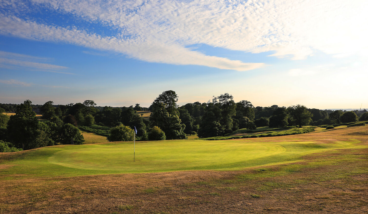"The last par three at Knole is the most testing. It runs along a ridge, which forms the highest part of the course, with wonderful views laid out below of the course, the house and the park. But it also runs uphill and back into the wind, and is very well protected. A superbly placed bunker short and left and another one, very deep and cut below the green to the right, catch many balls, and can wreck a card. If you can find the green, and have kept your score going over this and the previous two holes, you've done well, and with only two holes to go are almost home and dry."